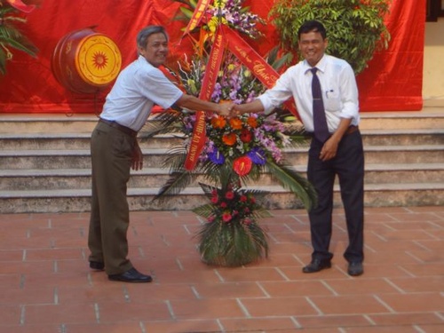Ông Nguyễn Mạnh Hùng – Bí thư đảng ủy xã Thượng Lâm (bên trái) chúc mừng nhà trường